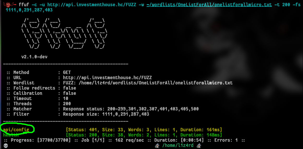 Depois ter gerado o token agora precisamos descobrir onde ele será usado. Pela lógica, com certeza deverá ter algum endpoint na api onde não possuimos permissão de acesso, por isso o tio ffuf já entrou em ação novamente nos dando o ouro: