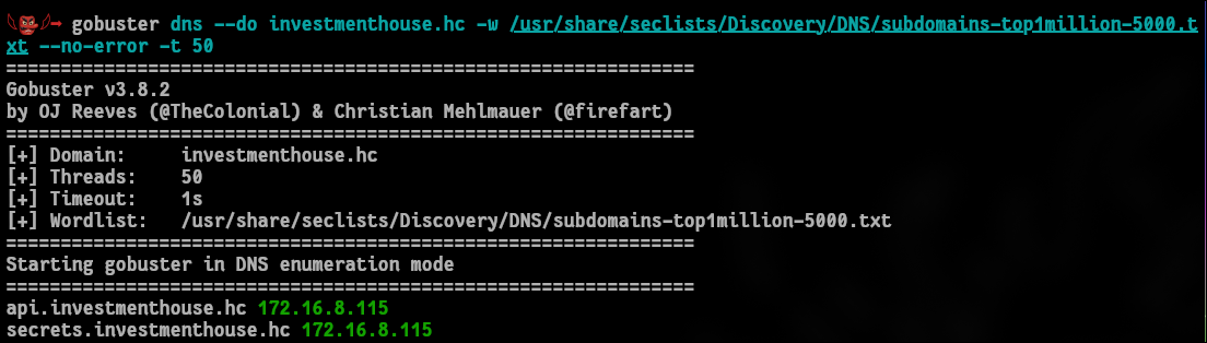 Antes de mergulhar de cabeça na aplicação é sempre interessante verificar se não há outros possíveis subdominios rodando. Usando o tio gobuster logo foi identificado dois novos subs, api e secrets: